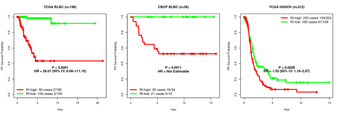 Fig.1 Application of BLBC signature to predict recurrence risk (RI-high and RI-low groups) in the TCGA BLBC, CBCP BLBC, and TCGA HGSOC cohorts, as measured by progression-free interval (PFI).