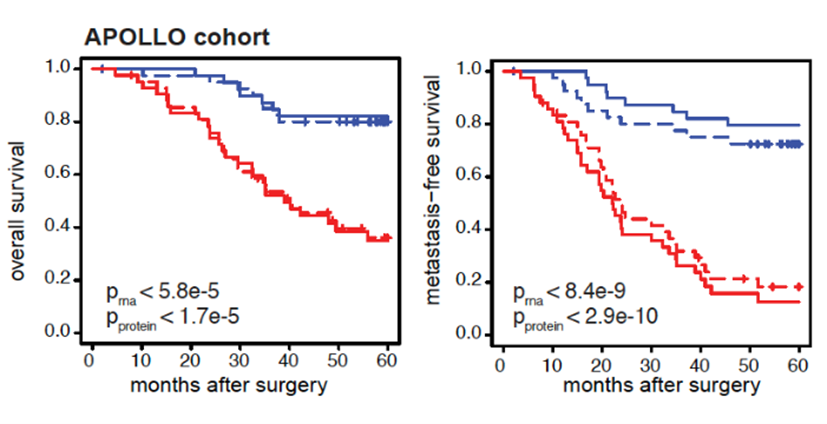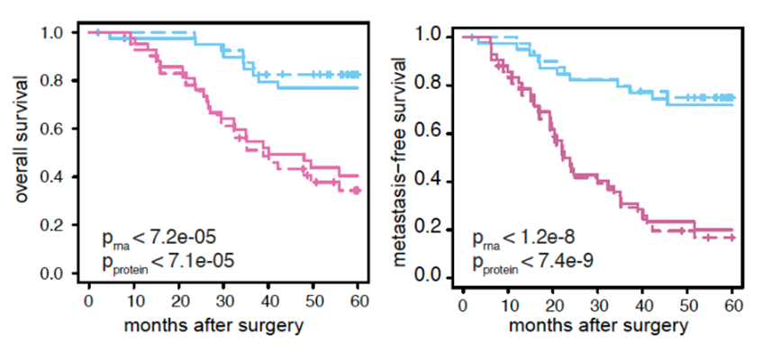 Investigation of RNA and protein expression signatures that predict overall survival (OS, survival form time of treatment initiation) and metastasis-free survival (MFS, survival from treatment initiation until recurrence or worsening) in LUAD tumors was to evaluate the aggressiveness level of the disease in a US population cohort. The signatures are multiplied by the weight of a protein or an RNA from an LUAD tumor and added with other signatures to make a risk score. High scores indicate a greater risk of shorter survival while low score indicate a lower risk of shorter survival. This technology can help health care workers to efficiently evaluate the level of severity of lung cancer in patients to aid in the clinical management of the disease.